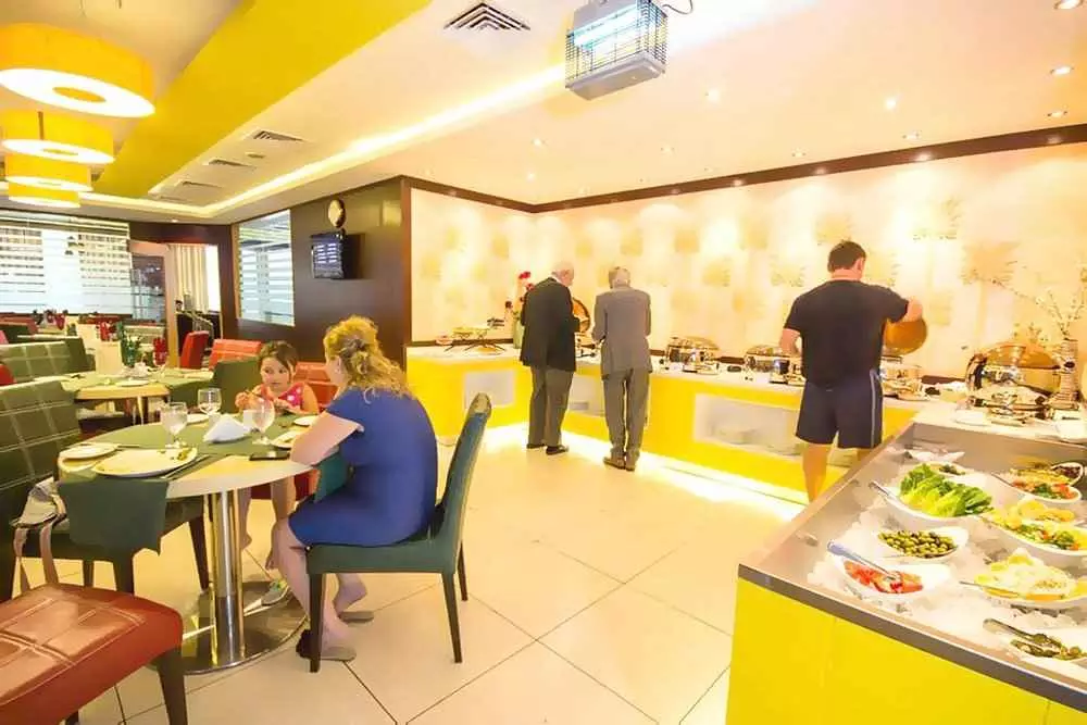 صبحانه: به صورت بوفه یا منوی انتخابی ارائه میشود؛ کیفیت متوسط، بیشتر غذاهای هندی و آسیایی.